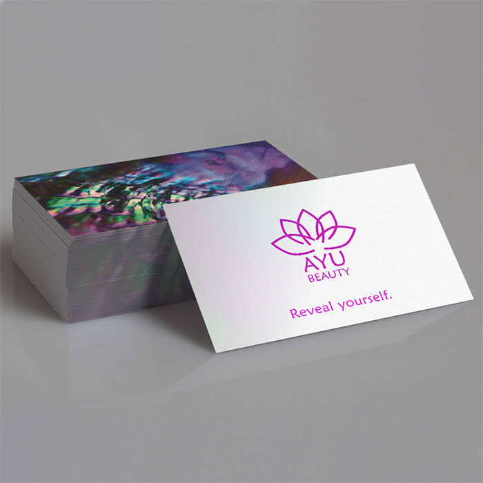 Next it’s onto your design. It’s time to think about your brand – what colours should you use? If you’re a family-friendly business, bright, fun colours or light pastels will fit well with your image. Do you work in a luxury sector – maybe a premium spa or salon? For something classy that really pops, we recommend our Pearl Business Cards – they shimmer and shine for a memorable impact.